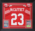 This Autographed Red Pro Style Framed Jersey has been Personally Signed by Christian McCaffrey of the San Francisco 49ers. This item is 100% Authentic to include a hologram by Beckett Authentication Services. This item will come with an affixed Beckett Authentication Services (BAS) authentication sticker, which includes a scannable QR code to verify authenticity. Please note that Beckett no longer provides serial-numbered COA cards, and the attached BAS sticker will serve as the complete authentication for this item. This is a BAS Witnessed Protection Program item which means a Beckett Authentication Service representative was present when this item was being signed. We conducted an autograph signing with Christian McCaffrey where multiples of the same item were signed. While the photographs are representative of this item, the size, placement and strength of the signature may vary. Each item is hand signed, therefore, each autograph is unique. This item can be verified through BAS Witnessed. This item has been professionally framed to overall dimensions of approximately 32 x 37 inches. This is a X-Large sized, non-branded, custom-stitched Framed Jersey. This jersey will be framed to order, it will take 3-4 days from purchase date for it to ship.