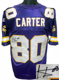 Cris Carter is an American former professional football wide receiver who played in the National Football League (NFL) for the Philadelphia Eagles (1987–1989), the Minnesota Vikings (1990–2001) and the Miami Dolphins (2002). He is widely regarded as one of the greatest wide receivers of all time. Carter played college football for the Ohio State Buckeyes and was selected by the Eagles in the fourth round of the 1987 NFL supplemental draft. Carter was voted to the Pro Football Hall of Fame on February 2, 2013. While in Philadelphia, head coach Buddy Ryan helped to coin one of ESPN's Chris Berman's famous quotes about Carter: "All he does is catch touchdowns." Cris Carter has hand signed this Minnesota Vikings Purple Official Vintage Starter TB NFL Authentic Stitched/Licensed Jersey, Size 46. Bold black full pristine jersey, signature inscribed #80, on #8. Beckett Authentication Signature Review Order ID : 84092, Order Item ID #101152 and Certificate of Authenticity from Athlon Sports Collectibles.