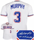 This is a new, in stock, Dale Murphy signed Atlanta White Throwback Unlicensed Custom Stitched Baseball Jersey with fully stitched twill numbers on the front and back, with 82 83 NL MVP inscription. There are NO LICENSED TEAM LOGOS, TAGS, BRAND NAMES or PATCHES ON THIS JERSEY & IS NOT AN AUTHENTIC OFFICIALLY LICENSED JERSEY, 100% polyester, made in the Philippines. Size XL (48/50). JSA Witnessed Authentication and JSA Certificate of Authenticity.