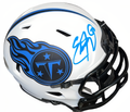 Eddie George won the NFL Rookie of the Year award in 1996, and was the Oilers/Titans' starting tailback through 2003, never missing a start due to injury. He made the Pro Bowl four consecutive years (1997-2000), and assisted the Titans to a championship appearance in Super Bowl XXXIV. His career totals include 10,441 rushing yards, 268 receptions, 2,227 receiving yards, and 78 touchdowns. Eddie George has hand autographed this Tennessee Titans Riddell Lunar Eclipse Mini helmet #27. Beckett Witnessed Authentication Sticker #WH09957 with Beckett Certificate of Authenticity.