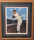 This beautifully framed color photograph features Frank Robinson, one of Major League Baseball’s all-time greats, in a poised batting stance wearing his San Francisco Giants uniform. The image is personally signed by Robinson in bold blue ink on the left side, with a clean and distinctive signature. The photo is double-matted in black, white, and red and presented in a woodgrain frame, offering a refined, vintage aesthetic perfect for display.
