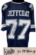 This is a new, in stock, Jim Jeffcoat signed Navy unlicensed Custom Stitched Pro Style Football Jersey with 2X SB Champ inscription, with fully stitched twill numbers on the front and back and players name plate, there are NO LOGOS, TAGS, BRAND NAMES or PATCHES ON THIS JERSEY & IS NOT AN AUTHENTIC OFFICIALLY LICENSED NFL JERSEY, 100% polyester, made in the Philippines. Size XL (48/50). JSA Witnessed Authentication Sticker & JSA Certificate of Authenticity.