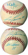 The Oakland A\'s had 3 consecutive American League Rookie of the Year winners. Jose Canseco was voted American League Rookie of the Year in 1986, Mark McGwire was voted American League Rookie of the Year in 1987 and Walt Weiss was voted American League Rookie of the Year in 1988. Jose Canseco, Mark McGwire & Walt Weiss have all three hand signed this Rawlings Official American League Baseball (Bobby Brown). All three included the year they won American League Rookie of the Year - 86/87/88. Full Blue Pen Signatures, minor tone spots, sold as is. Beckett Authentication Signature Review Order ID : 99315, Order Item ID #119886. Image of actual item in stock - as shown