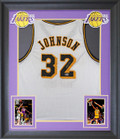 This Autographed w/ Black Numbers White Pro Style Framed Jersey has been Personally Signed by Magic Johnson of the Los Angeles Lakers. This item is 100% Authentic to include a hologram by Beckett Authentication Services. This item will come with an affixed Beckett Authentication Services (BAS) authentication sticker, which includes a scannable QR code to verify authenticity. Please note that Beckett no longer provides serial-numbered COA cards, and the attached BAS sticker will serve as the complete authentication for this item. This is a BAS Witnessed Protection Program item which means a Beckett Authentication Service representative was present when this item was being signed. We conducted an autograph signing with Magic Johnson where multiples of the same item were signed. While the photographs are representative of this item, the size, placement and strength of the signature may vary. Each item is hand signed, therefore, each autograph is unique. This item can be verified through BAS Witnessed. This item has been professionally framed to overall dimensions of approximately 32 x 37 inches. This is a X-Large sized, non-branded, custom-stitched Framed Jersey. This jersey will be framed to order, it will take 3-4 days from purchase date for it to ship.