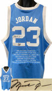 Team Nike on-court style jersey. Everything is sewn on, size 46. Hand-signed by Michael Jordan (HOF). Jordan's career highlights have been custom stitched onto the back of the jersey below the reverse numbers. The jersey is a limited edition and has been hand-numbered #4/23.This is one of the hardest Michael Jordan jerseys to find. This is a limited edition (23) authentic Nike UNC Light Blue jersey autographed by Michael Jordan. Included on this jersey are some of the key player stats for MJ during his time at UNC. These statistics are embroidered onto the jersey. This jersey comes with the original UDA certificate of authenticity. UDA Registration as well as the tamper proof hologram. Amazing full pristine signature ! Michael Jordan was named ACC Freshman of the Year for the 1981-82 season at North Carolina. Jordan was selected by consensus to the NCAA All-American First Team in both his sophomore (1983) and junior (1984) seasons.
