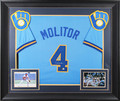 This Autographed Light Blue Pro Style Framed Jersey has been Personally Signed by Paul Molitor of the Milwaukee Brewers. This item is 100% Authentic to include a hologram by Beckett Authentication Services. This item will come with an affixed Beckett Authentication Services (BAS) authentication sticker, which includes a scannable QR code to verify authenticity. Please note that Beckett no longer provides serial-numbered COA cards, and the attached BAS sticker will serve as the complete authentication for this item. We conducted an autograph signing with Paul Molitor where multiples of the same item were signed. While the photographs are representative of this item, the size, placement and strength of the signature may vary. Each item is hand signed, therefore, each autograph is unique. This item can be verified through BAS. This item has been professionally framed to overall dimensions of approximately 32 x 37 inches. This is a X-Large sized, non-branded, custom-stitched Framed Jersey. This jersey will be framed to order, it will take 3-4 days from purchase date for it to ship.