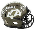 This Autographed Alternate Salute To Service Speed Mini Helmet with the inscription of "HOF 99 (Dickerson)" has been Personally Signed by Eric Dickerson & Marshall Faulk of the Los Angeles Rams. This item is 100% Authentic to include a hologram by Beckett Authentication Services. This item will come with an affixed Beckett Authentication Services (BAS) authentication sticker, which includes a scannable QR code to verify authenticity. Please note that Beckett no longer provides serial-numbered COA cards, and the attached BAS sticker will serve as the complete authentication for this item. This is a BAS Witnessed Protection Program item which means a Beckett Authentication Service representative was present when this item was being signed. We conducted an autograph signing with Eric Dickerson & Marshall Faulk where multiples of the same item were signed. While the photographs are representative of this item, the size, placement and strength of the signature may vary. Each item is hand signed, therefore, each autograph is unique. This item can be verified through BAS Witnessed.