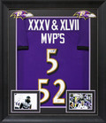 This Autographed Purple Pro Style Framed Jersey has been Personally Signed by Ray Lewis & Joe Flacco of the Baltimore Ravens. This item is 100% Authentic to include a hologram by Beckett Authentication Services. This item will come with an affixed Beckett Authentication Services (BAS) authentication sticker, which includes a scannable QR code to verify authenticity. Please note that Beckett no longer provides serial-numbered COA cards, and the attached BAS sticker will serve as the complete authentication for this item. This is a BAS Witnessed Protection Program item which means a Beckett Authentication Service representative was present when this item was being signed. We conducted an autograph signing with Ray Lewis & Joe Flacco where multiples of the same item were signed. While the photographs are representative of this item, the size, placement and strength of the signature may vary. Each item is hand signed, therefore, each autograph is unique. This item can be verified through BAS Witnessed. This item has been professionally framed to overall dimensions of approximately 32 x 37 inches. This is a X-Large sized, non-branded, custom-stitched Framed Jersey. These jerseys are framed to order, it takes approximately 3-4 business days for framing to be completed.