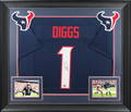 This Autographed Navy Blue Pro Style Framed Jersey has been Personally Signed by Stefon Diggs of the Houston Texans. This item is 100% Authentic to include a hologram by Beckett Authentication Services. This item will come with an affixed Beckett Authentication Services (BAS) authentication sticker, which includes a scannable QR code to verify authenticity. Please note that Beckett no longer provides serial-numbered COA cards, and the attached BAS sticker will serve as the complete authentication for this item. This is a BAS Witnessed Protection Program item which means a Beckett Authentication Service representative was present when this item was being signed. We conducted an autograph signing with Stefon Diggs where multiples of the same item were signed. While the photographs are representative of this item, the size, placement and strength of the signature may vary. Each item is hand signed, therefore, each autograph is unique. This item can be verified through BAS Witnessed. This item has been professionally framed to overall dimensions of approximately 32 x 37 inches. This is a X-Large sized, non-branded, custom-stitched Framed Jersey. This jersey will be framed to order, it will take 3-4 days from purchase date for it to ship.