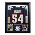 Tedy Bruschi professionally framed hand signed, custom stitched football jersey with premium suede matte, wood frame and plexiglass cover.