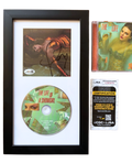 An elegant framed display featuring a hand-signed The Life of a Showgirl CD cover by Taylor Swift. This version showcases an alternate cover image, professionally matted and framed alongside the official CD, creating a striking collectible ready for wall display.