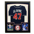 Tom Glavine professionally framed hand signed, custom stitched baseball jersey with premium suede matte, wood frame and plexiglass cover.