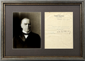 A 1p typed letter signed by future 25th U.S. President William McKinley (1843-1901), as "W McKinley" at center, recently reelected as Ohio Governor. November 13, 1893. [Columbus, Ohio]. Typed in blue on a leaf of watermarked stationery with "State of Ohio / Executive Department / Office of the Governor" letterhead. Expected wear including flattened transmittal folds and a few extra wrinkles. Isolated foxing, edge chipping, and marginal closed tears, else near fine. 7.75" x 10.75."