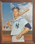 This beautiful framed photograph features Mickey Mantle, one of baseball’s most iconic figures, in his familiar Yankees pinstripes during the 1950s. Mantle is pictured in a relaxed batting pose — bat on shoulder, blue sky behind him, and a confident expression that epitomized the Yankee dynasty era.